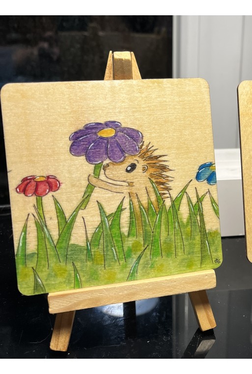 Cette création est une illustration unique réalisée sur une tranche de bois au format 10 × 10 cm, présentée sur un petit chevalet. Chaque pièce est entièrement originale, ce qui en fait un objet artisanal singulier.